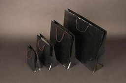 Černý tisk na bílém křídovém papíru. Lesklé lamino.Černá bavlněná držadla. Karton na dně. Vhodné pro dotisk sítotiskem. |