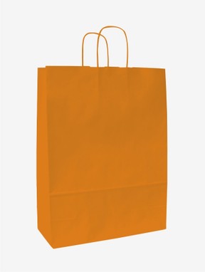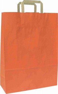 Oranžová taška Oranžový tisk na hnědém sulfátovém papíru 100g.Hnědé ploché papírové držadlo. Vhodné pro potisk sítotiskem. |